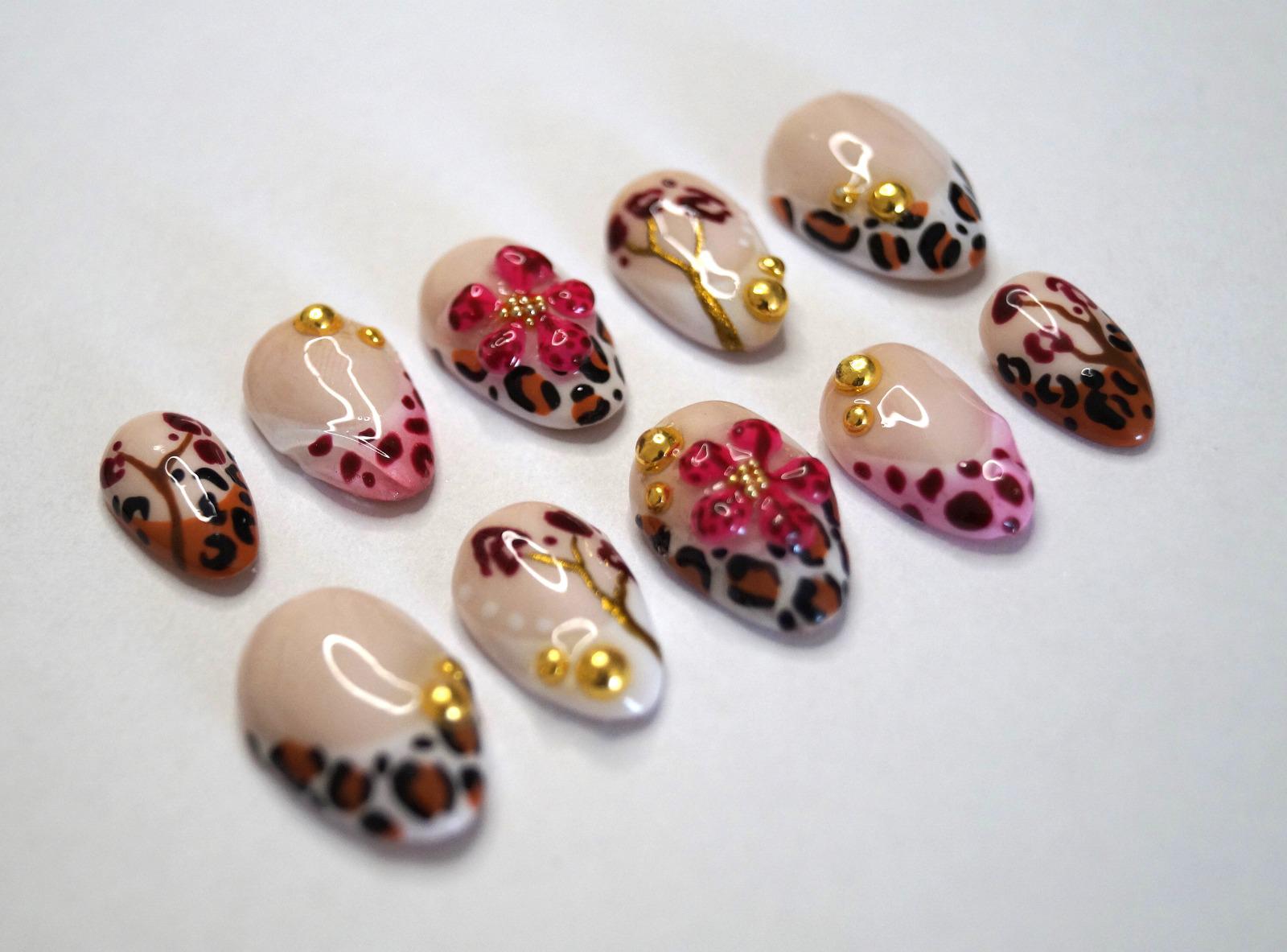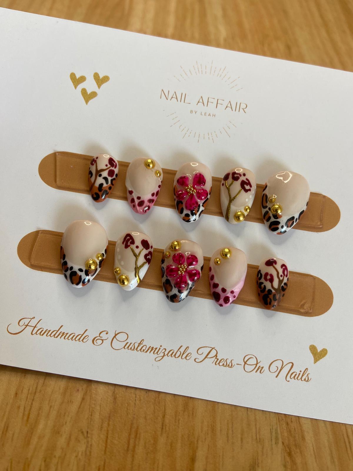 Step out and get wild this summer with these cute Press-On Nails from Nail_Affair_byLeah. 3D flowers and leo print are the perfect addition to your summer nails.