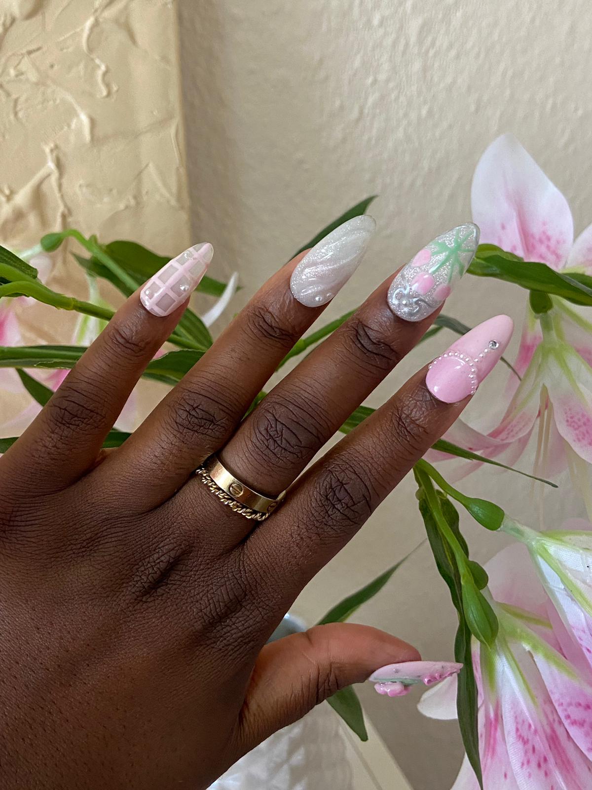 These press-on nails represent the first blush of spring. The lush tulips evoke the calming essence of spring, while the soft pinks call to mind the delicate touch of spring.